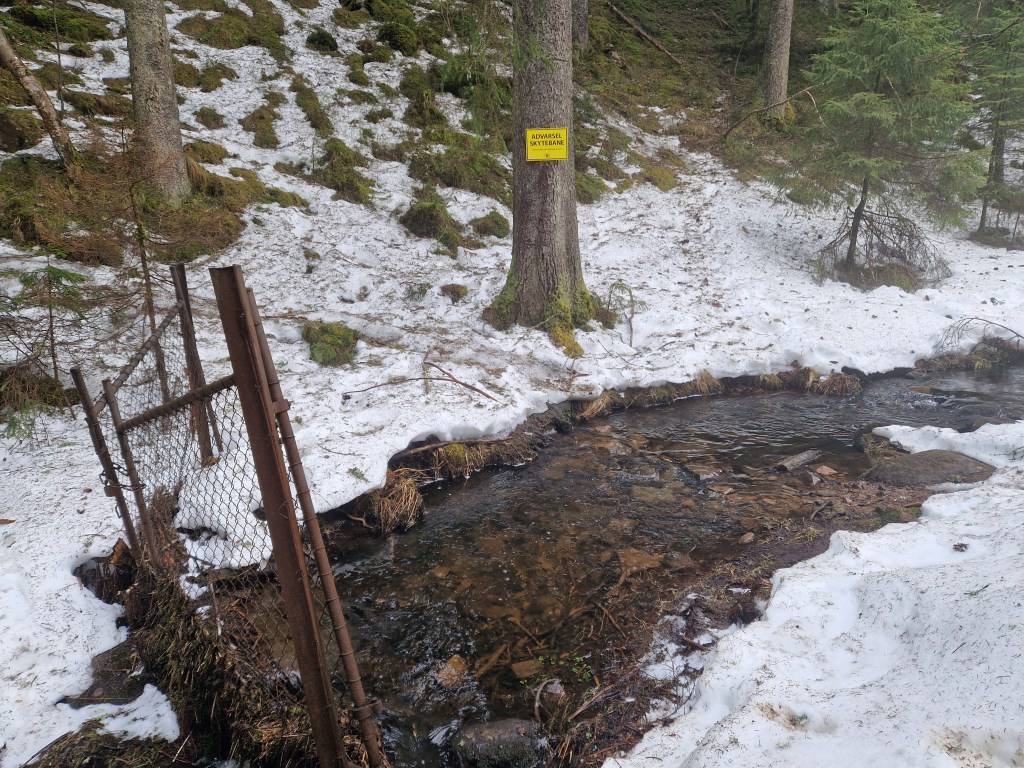 12:40 Får endelig øye på den fryktede «skytebanen». Ser at det var langt mer ordna forhold enn jeg fantaserte om. Her må man stå i designerte båser og skyte på blink. Hva trodde jeg egentlig? At folk løp rundt og skøyt vilt? Legger merke til bekken rett ved blinkene.