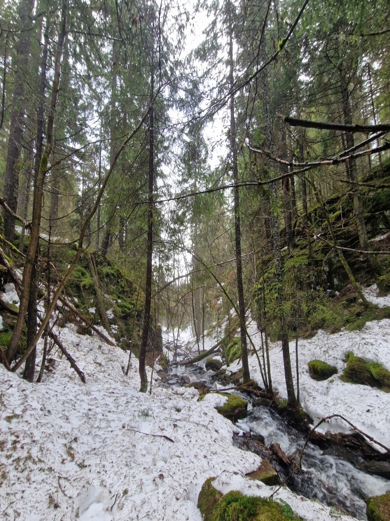 11:10 Bekken og jeg skiller lag med turstiene. Jeg er fast bestemt på å gå så tett på bekken som mulig. Terrenget er ulendt og delvis skjult av den overraskende dype snøen, så det er ikke veldig lett å følge bekkens vilje og vei. Vann har en utrolig evne til å gå rett frem samme hva det støter på. Jeg er ikke like sterk som H2O.