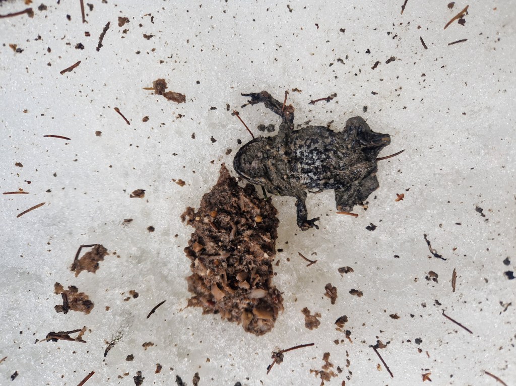En død padde foran meg bringer bud om død. (Ligger innvollene ved siden av? Invertert padde?)