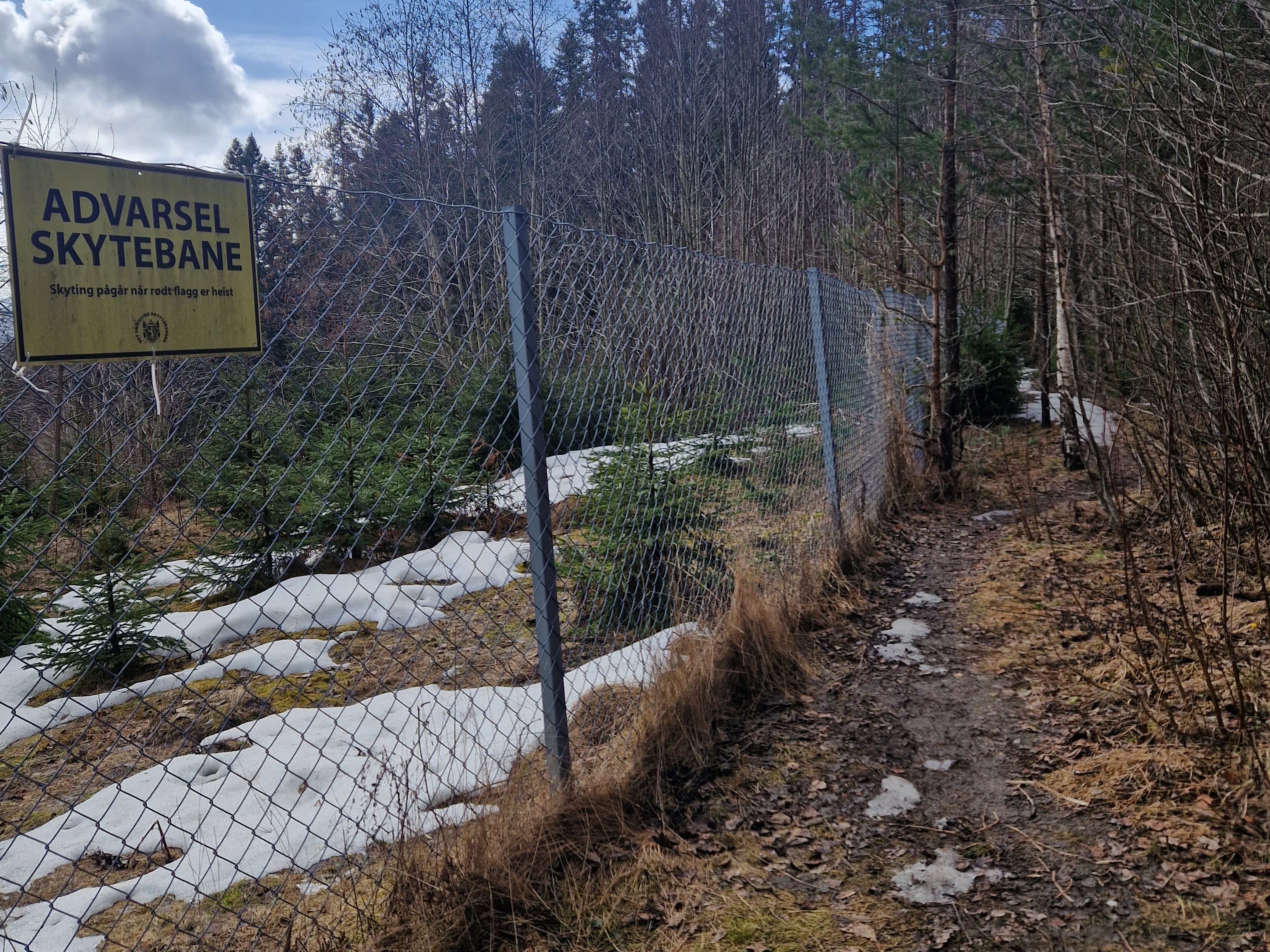 11:45 SKYTEBANESKILT OG GJERDE tvers over bekken ber meg om å snu. SKYTING!? Fader. Blir enda mer redd! Må fnise av all denne teite frykten jeg kjenner på. Men altså. Det hadde tatt seg ut å bli skutt oppi her, da! «Skyting pågår når rødt flagg er heist». Ingen røde flagg i sikte. Googler litt og beslutter å fortsette ferden.